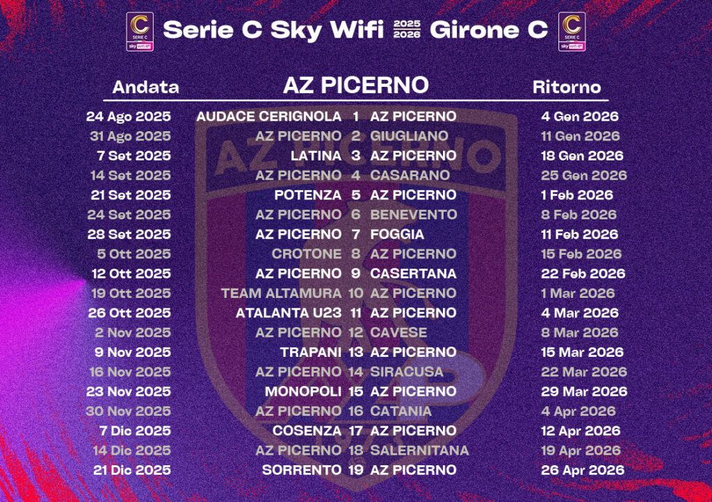 POTENZA – Ora si comincia a fare sul serio. Con il varo dei calendari di Serie C la nuova stagione può dirsi davvero al via. Le lucane partono subito fuori casa. Il 24 agosto il Potenza farà visita al Giugliano, mentre il Picerno sarà di scena a Cerignola. Attesa brevissima per il derby: si gioca alla quinta giornata: andata al Viviani il 21 settembre, ritorno al Curcio l’1 febbraio 2026. Chiusure casalinghe per entrambe, la stagione regolare andrà in archivio con Potenza-Monopoli e Picerno-Sorrento il 26 aprile.